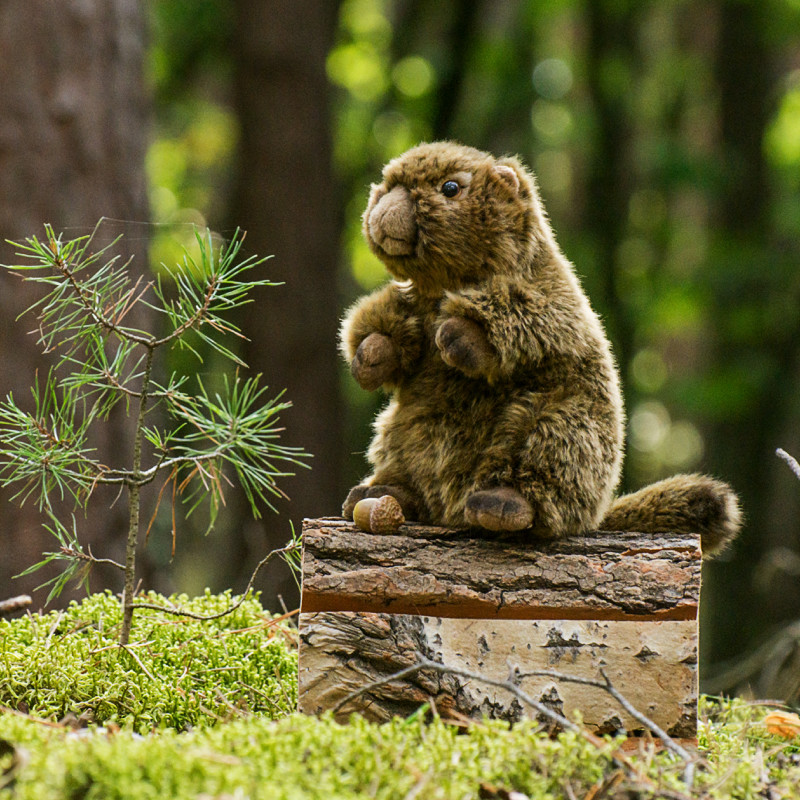 Es hat eine stehende Haltung, natürliche und schicke braune Fellfarbe und ist bereit nach etwas zu greifen oder mit dem neuen Besitzer zu spielen. Das Murmeltier hat einen flauschigen Schwanz, hübsche Knopfaugen und zwei winzig kleine Öhrchen, die einfach zum Verlieben sind.